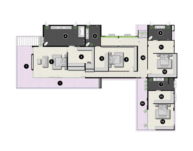 - Private saltwater swimming pools set in lush, landscaped gardens
